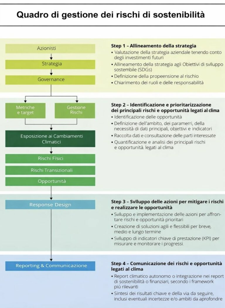 Questo articolo propone un quadro di gestione dei rischi di sostenibilità (climatici e non solo) pensato per essere pratico: una struttura in 4 fasi che integra strategia, governance, dati e reporting. È lo stesso tipo di architettura che permette di passare dal “racconto” alla decisione misurabile.