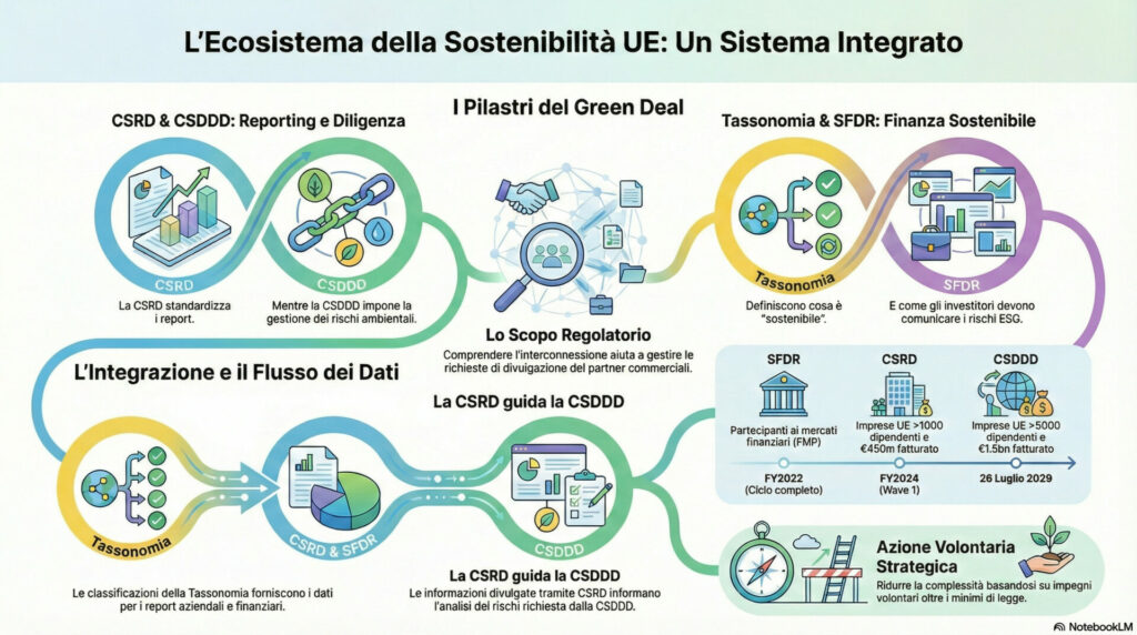 Significa che CSRD, CSDDD, Tassonomia UE e SFDR non operano come silos: i dati ESG e le disclosure si alimentano reciprocamente lungo flussi informativi con feedback loop.