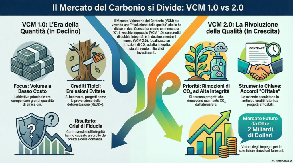 Il Mercato Volontario del Carbonio (VCM) sta vivendo una trasformazione strutturale, sempre più evidente per chi si occupa di strategie climatiche e decarbonizzazione aziendale. Non si tratta di una semplice evoluzione tecnica, ma di una vera e propria “rivoluzione della qualità”: il mercato si sta dividendo in due traiettorie molto diverse.